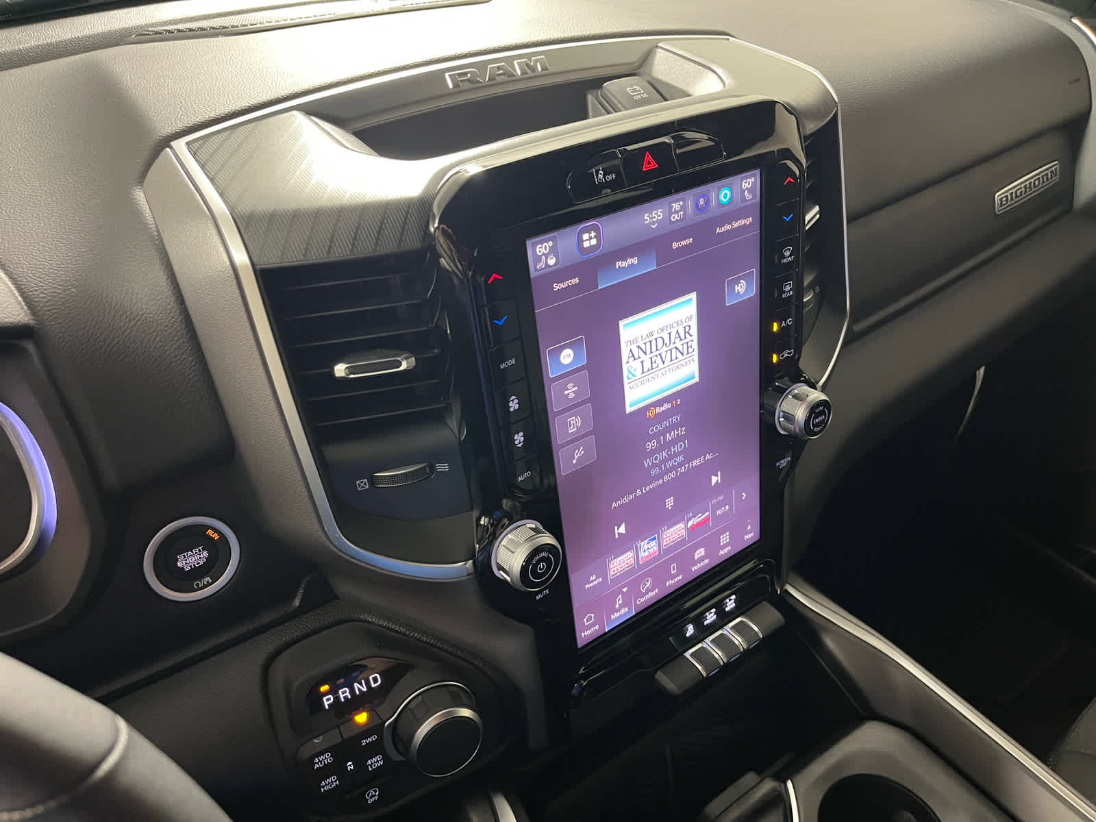 BIG HORN LEVEL 2 EQUIPMENT GROUP SiriusXM Radio Service, Power Adjustable Pedals, Leather Wrapped Steering Wheel, 12 Touchscreen Display, Glove Box Lamp, Auto Power-Folding Mirrors, 115V Auxiliary Rear Power Outlet, Media Hub w/2 Charge Only USBs, Heated Front Seats, Security Alarm, Black Premium Power Mirrors, Premium Overhead Console, 9 Amplified Speakers w/Subwoofer, Disassociated Touchscreen Display, Body Color Fender Flares, Remote Tailgate Release, 115V Auxiliary Power Outlet, LED Dome Lamp w/On/Off Switch, Universal Garage Door Opener, 2nd Row In Floor Storage Bins, Sun Visors w/Illuminated Vanity Mirrors, LED Footwell Lighting, Rear Window Defroster, Rear View Auto Dim Mirror, Rear Power Sliding Window, GPS Navigation, Overhead LED Lamps, Wheels: 20 x 9 Aluminum Chrome Clad, ENGINE: 5.7L V8 HEMI MDS VVT ETORQUE Active Noise Control System, Heavy Duty Engine Cooling, Passive Tuned Mass Damper, GVWR: 7,100 lbs, Dual Rear Exhaust w/Bright Tips, G/T Exhaust, 18 Aluminum Spare Wheel, DUAL-PANE PANORAMIC SUNROOF Dome Dual LED Reading Lamp, NIGHT EDITION Tires: 275/55R20 OWL All Season, Bridgestone Brand Tires, Accent Color Premium Power Mirrors, Exterior Mirrors w/Supplemental Signals, Black Headlamp Bezels, Exterior Mirrors Courtesy Lamps, Grille Black Surround Black Mesh, Auto Power-Folding Mirrors, Wheels: 20 x 9.0 Aluminum Painted Clad, Auto Dim Exterior Driver Mirror, Black Exterior Truck Badging, Anti-Spin Differential Rear Axle, Accent Color Door Handles, Accent Color Tailgate Handle, Black Interior Accents, Dual Exhaust w/Black Tips, Body Color Front Bumper, Body Color Rear Bumper w/Step Pads, Black Tail Lamp Bezels, RAM Grille Badge - Black, Black Painted Exterior Mirrors Caps, TRANSMISSION: 8-SPEED AUTOMATIC (8HP75).